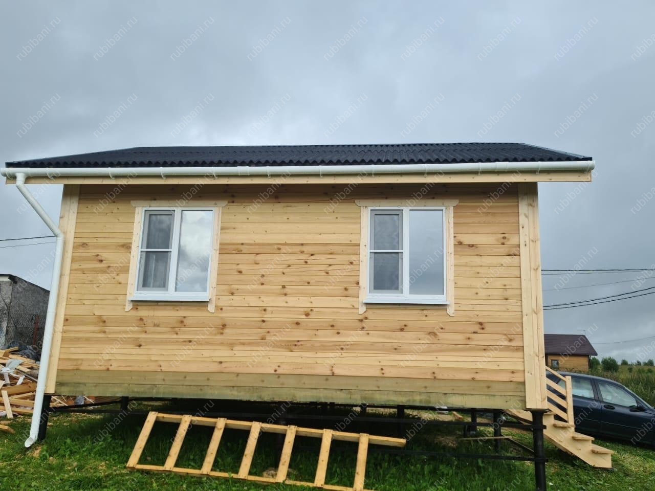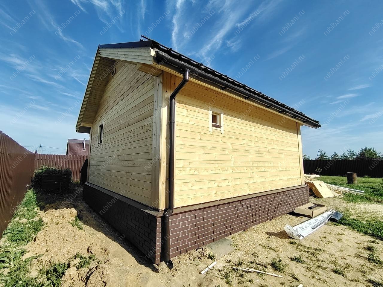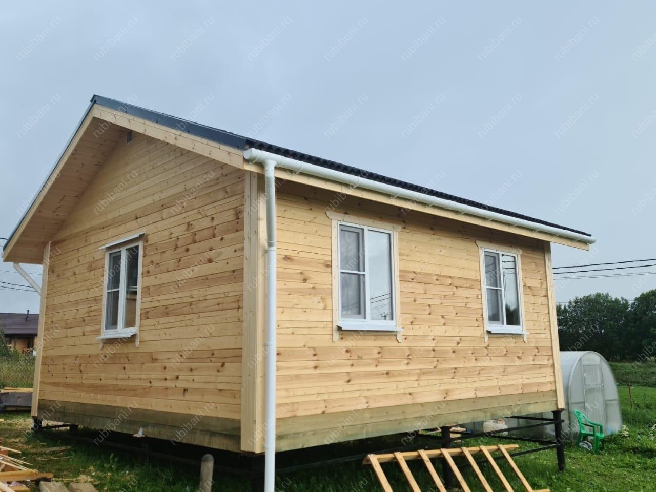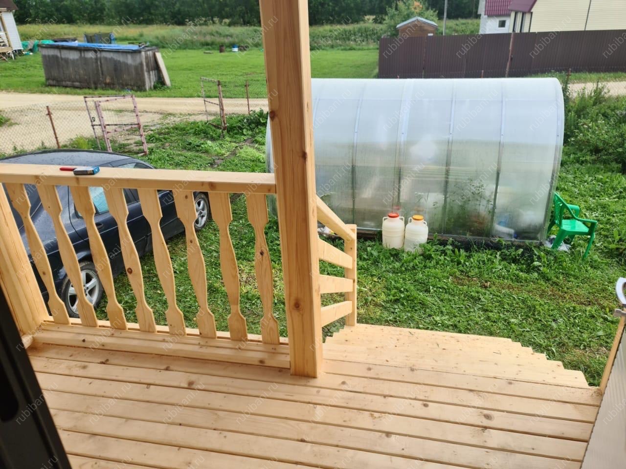 Конструкция бани и веранды выполнена из профилированного бруса, обеспечивающего отличную теплоизоляцию и долговечность. Компактная веранда существенно расширяет полезную площадь, создавая плавный переход между интерьером бани и окружающей природой, не нарушая гармонии участка.