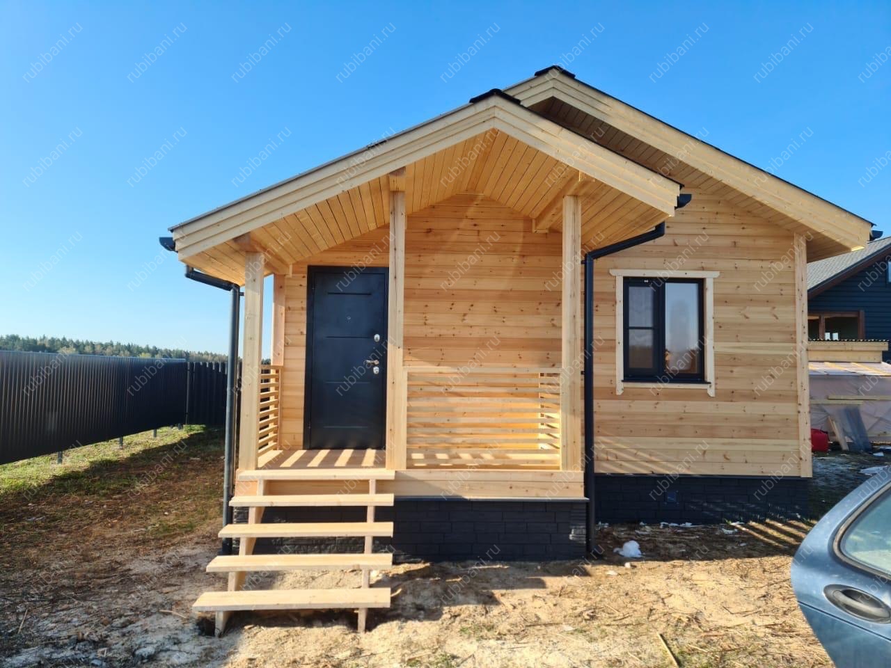 Визитной карточкой проекта стало стильное крыльцо с надежными ступенями и защитным козырьком, тщательно интегрированное в общий дизайн бани, подчеркивая качество исполнения и добавляя респектабельности фасаду.